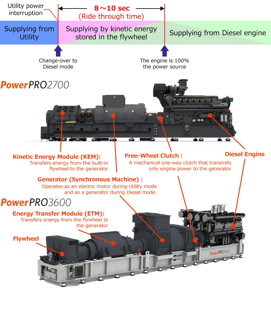 During Utility mode which means normal utility power operation, the flywheel is continuously rotated using electrical energy, storing energy in the form of kinetic energy. In the event of a power outage or other utility power failure, KEM/ETM converts the flywheel’s kinetic energy back into electrical energy to supply power to the load until the diesel engine starts in seconds, thereby ensuring uninterrupted power supply.