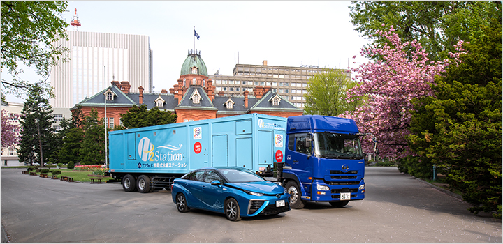 エア・ウォーターは、北海道に3か所(札幌市、室蘭市、鹿追町)ある水素ステーションの設計・製作と運用業務に携わっています。水素ステーションは、FCVに水素を充填する施設で、ガソリン車で言う「ガソリンスタンド」に該当します。札幌市、室蘭市の水素ステーションは、水素を充填する機能を有する設備を40フィートコンテナ内に搭載した移動可能な設備です。北海道内のFCVは、自治体や民間企業等の保有を中心に徐々に普及しています。