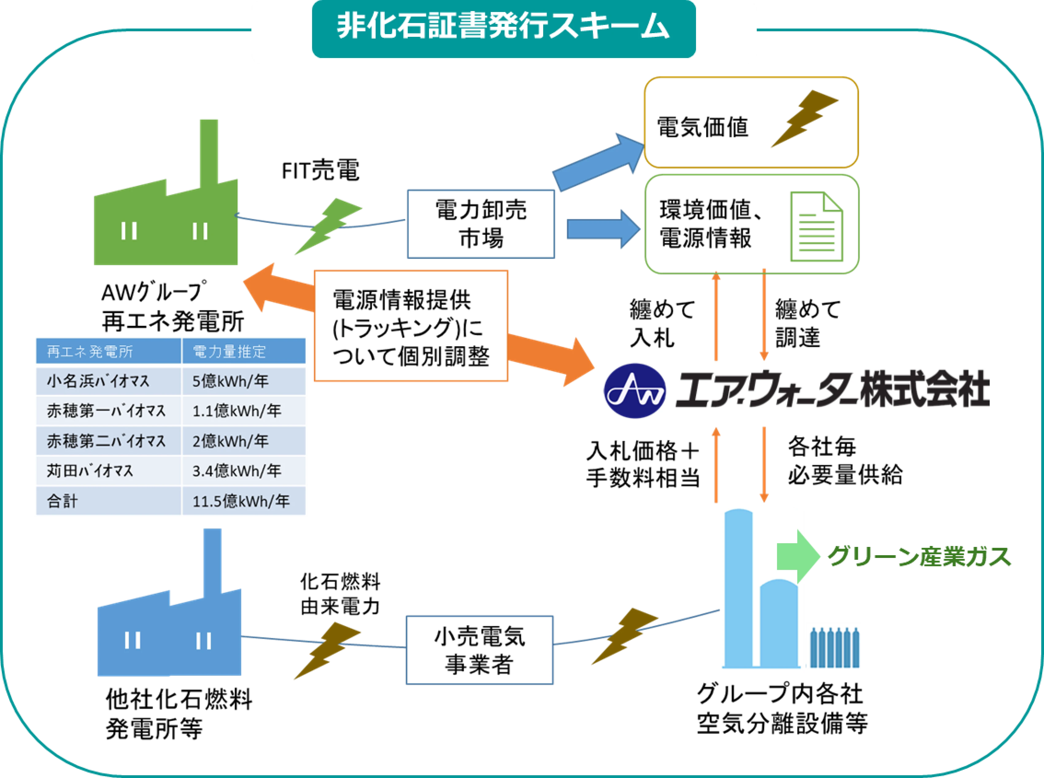 - マスバランス方式を用い、特定のお客様向けの産業ガス製造時に使用する電力に対して非化石証書を割当て、その電力を実質再生可能エネルギーとする現実的な事業性