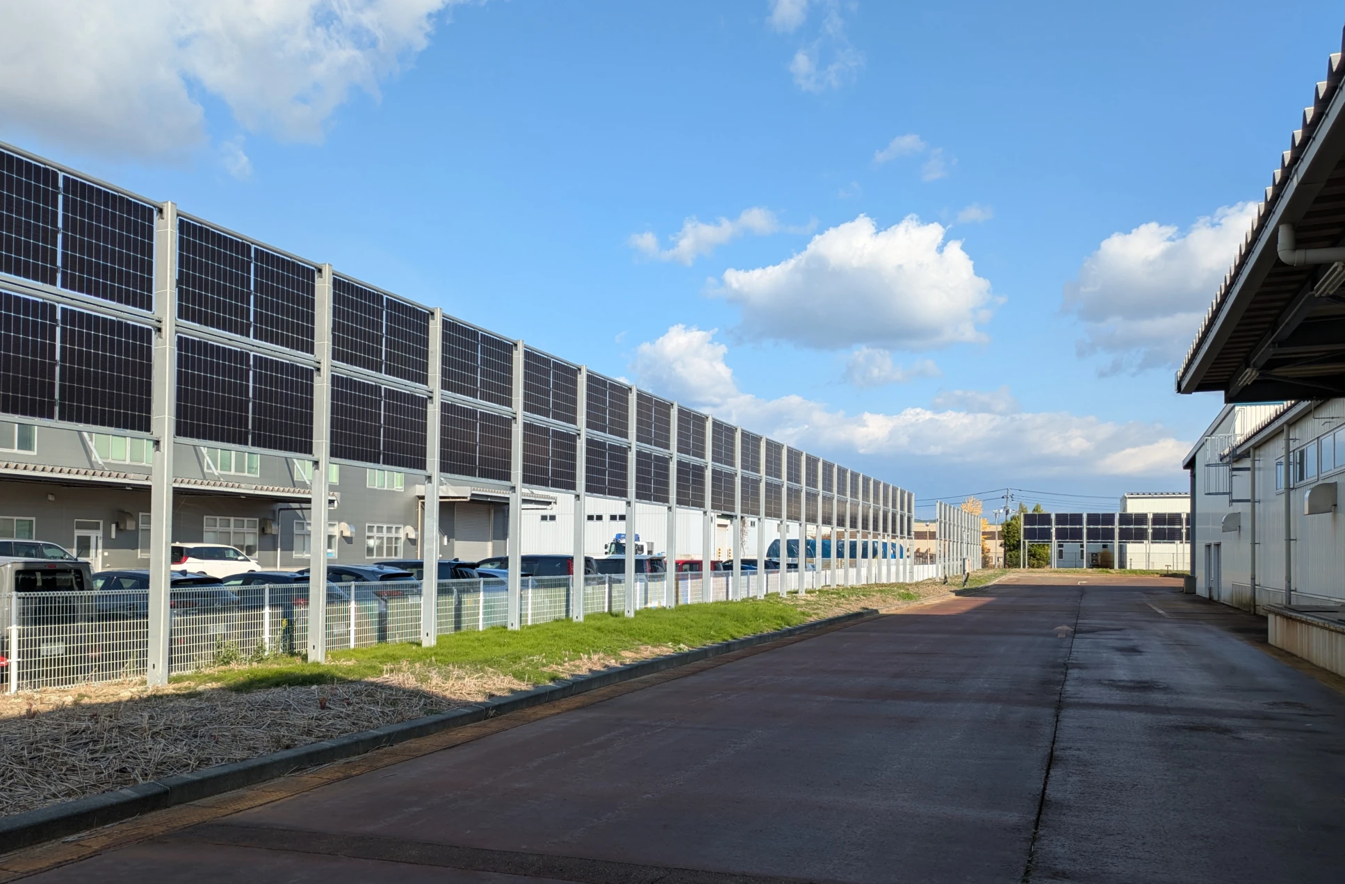 VERPAは、豪雪地帯や屋根構造の制約、敷地の狭さなど、従来型太陽光発電設備の導入が難しかった事業所でも設置可能で、敷地境界線沿いや駐車場、緑地内、通路脇などに幅2.5mのスペースがあれば施工できます。さらに、パネルは地表から2m以上の高さに設置するため、安全柵やフェンスが不要で、設置場所を他用途と共用できる点も特徴です。