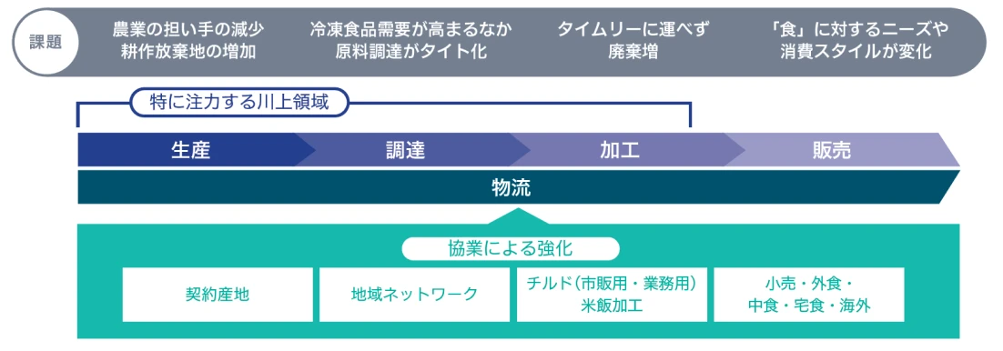 国内の農業は就農者の減少や気候変動による収穫量減など、さまざまな課題に直面しています。エア・ウォーターグループは、強固な事業基盤を有する北海道を中心に農業の課題解決に貢献し、「食の安全保障」に向けた事業展開を進めており、農産物サプライチェーンの川上領域(生産・調達、製造・加工)を強化しています。その一環として、農産支援や契約栽培に加え、加工・保存技術の強化と、物流網を活かした物流・販売の価値最大化に取り組んでいます。また、複数の協業先との連携により技術・事業資源を相互活用し、サプライチェーンの強化とフードロス削減につながる新事業の拡大にも力を注いでいます。