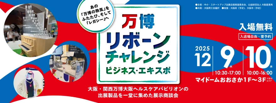 本イベントは、大阪・関西万博の大阪ヘルスケアパビリオン「リボーンチャレンジ」の出展製品を一堂に集めた展示商談会です。