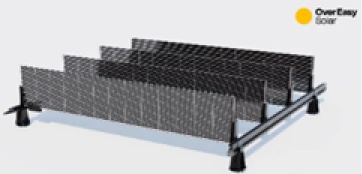 ノルウェー企業のOver Easy Solar社が開発した背丈が低い屋根置きタイプの垂直ソーラーです。水平屋根等に並べて連結させるだけで設置でき、アンカー固定や穴開け工事が不要です。わずか12kg/㎡と軽量で、建物の構造体に固定させないため、耐震性に悪影響を与えません。屋上緑化とも共存可能です。