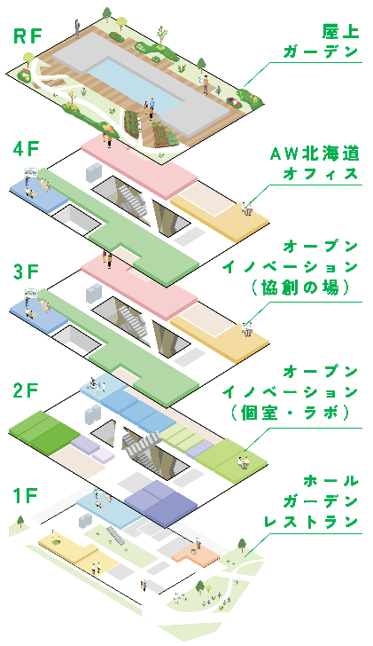 北海道の知を集結し、北海道の強みを活かした新しい事業を創出するオープンイノベーション施設。木造建築で吹き抜けが特徴的な施設内にはコワーキングスペースやラボを備え、大学や自治体、地元企業やスタートアップなどと連携、地域住民の方々との交流を深めながら、新しいアイデアと発想で「エネルギー・環境」「農業と食」を中心とした地域の社会課題解決に取り組みます。さまざまなステークホルダーの皆さまと連携を図りながら、イノベーションの創出や新しい価値づくりを目指し、社会課題解決のための交流会やイベント、新ビジネス支援などさまざまな企画を進めてまいります。