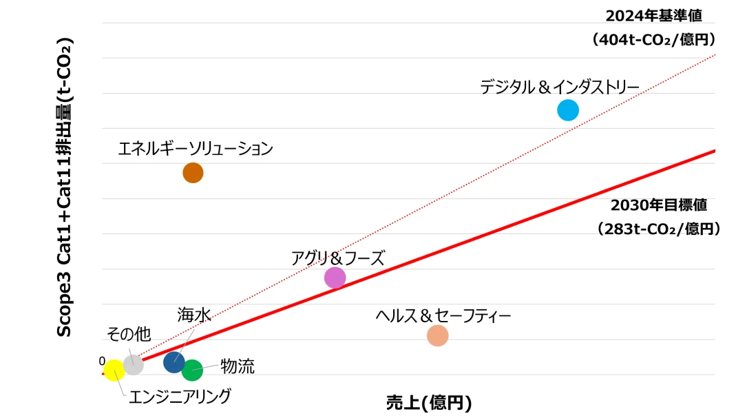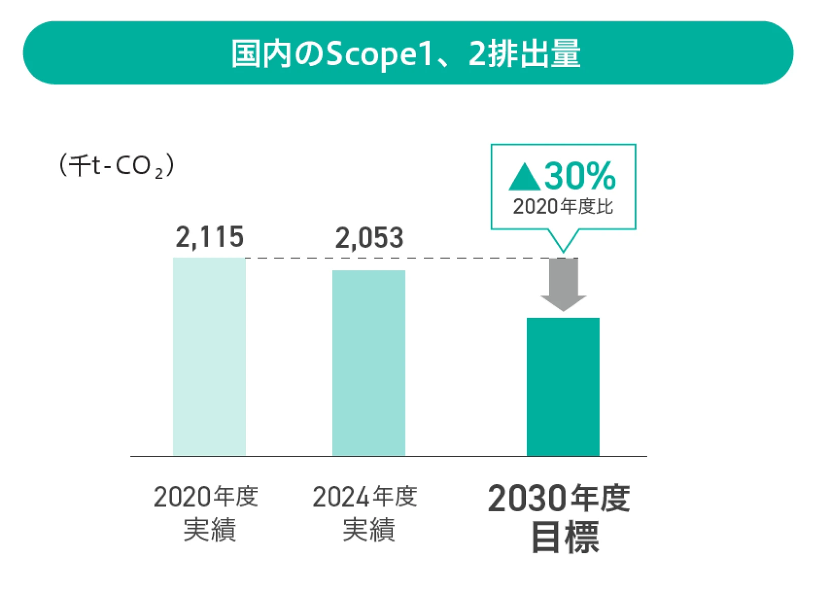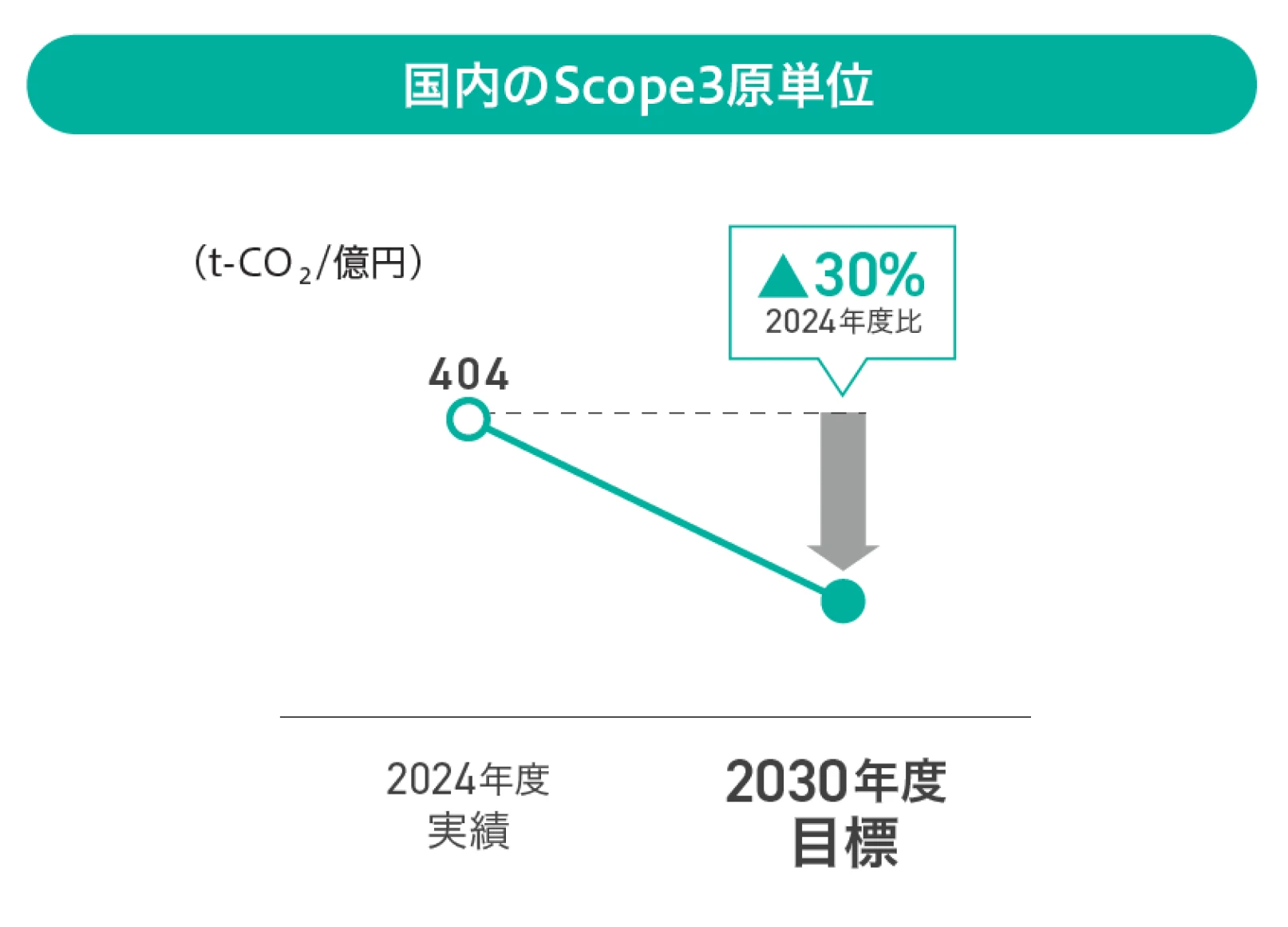 また、Scope3排出量の削減目標は国内連結会社のカテゴリ1(購入した製品・サービス)とカテゴリ11(販売した製品の使用)の合計を対象とし、2030年度において2024年度比で売上原単位30%削減することを定め、2025年度よりサプライチェーン排出量の削減に取り組んでいきます。