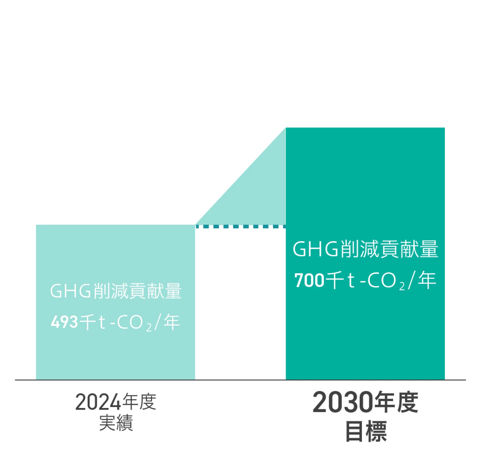 低炭素・脱炭素に貢献する主な製品・サービスは、FIT制度を活用した木質バイオマス発電事業、液化天然ガス(LNG)の代替燃料となるクリーンなエネルギーの液化バイオメタン(LMB)、積雪地や駐車場へ設置しやすい垂直ソーラー発電システム「VERPA®」などがあり、これらを通じてGHG削減貢献量は現在493千t-CO₂/年(2024年度実績)ですが、2030年度に700千t-CO₂/年以上達成を目指します。