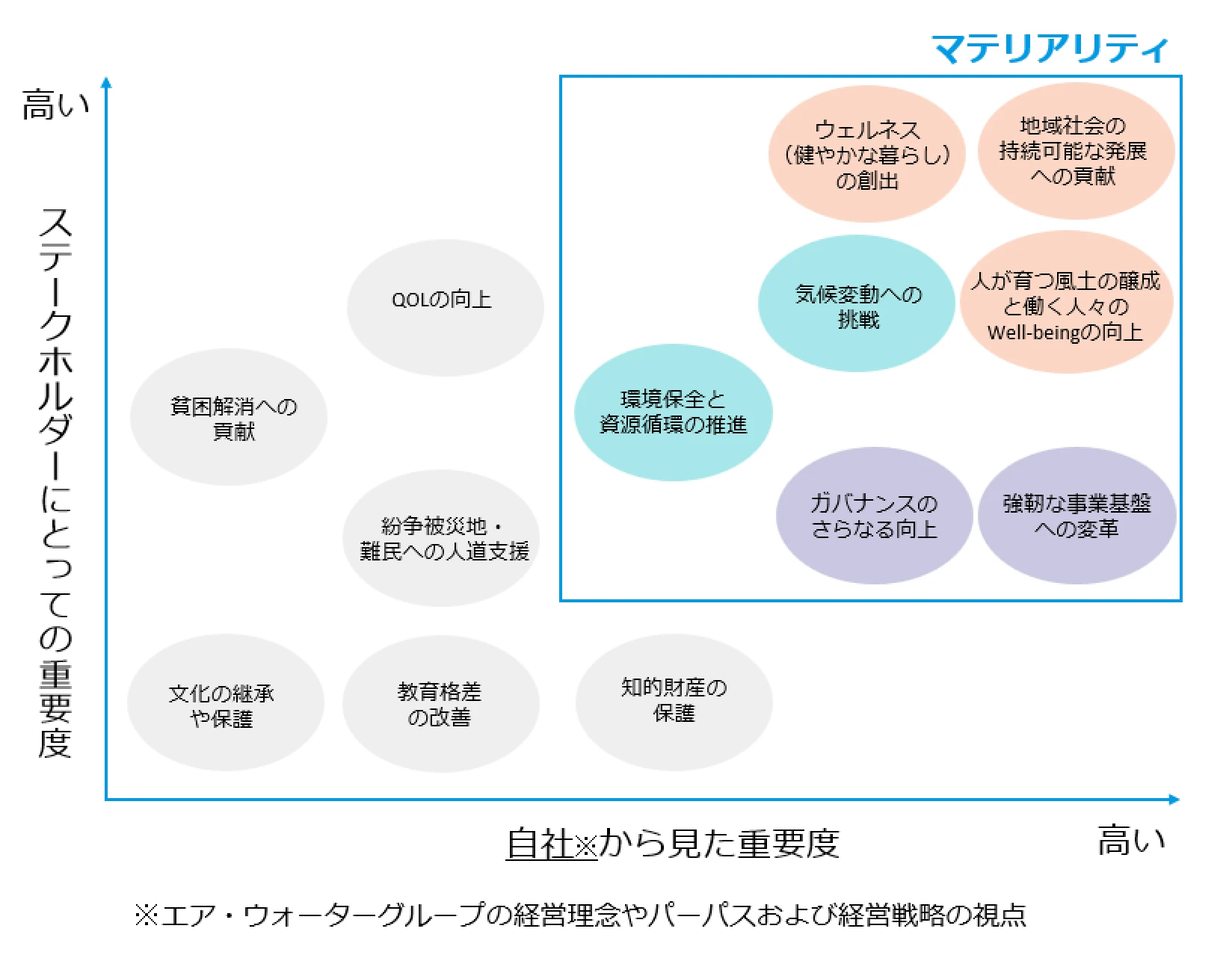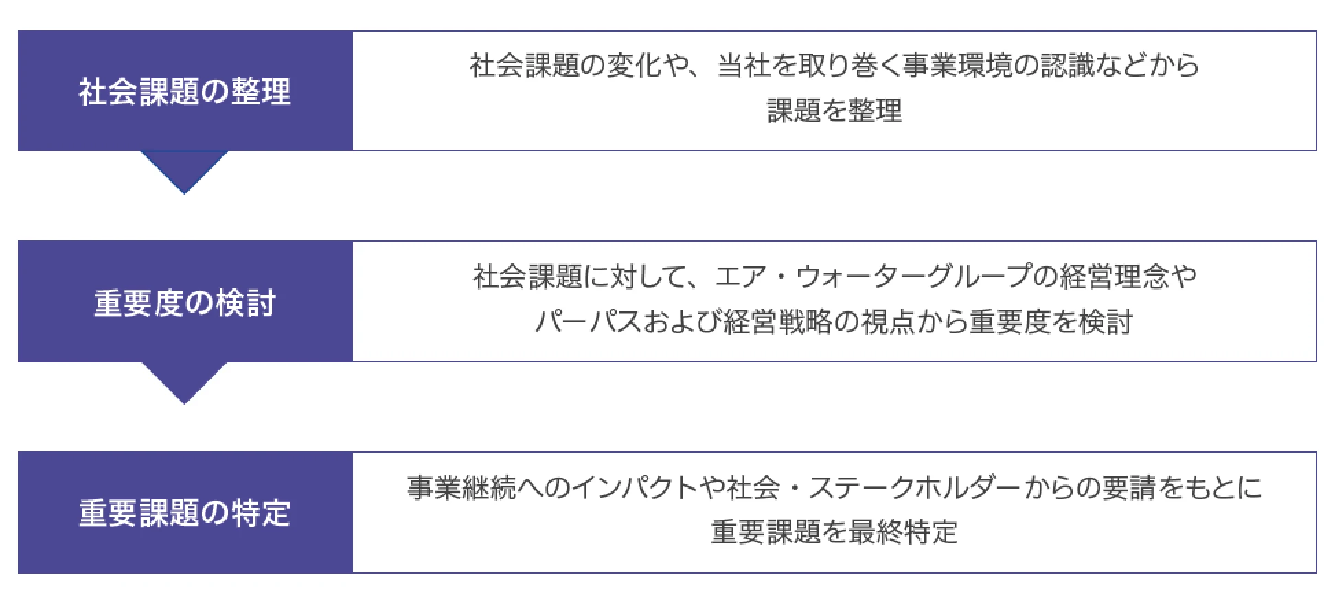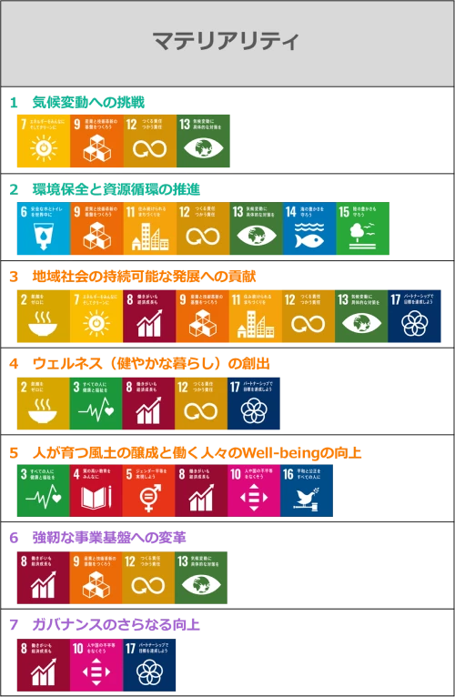 サステナブルビジョンの実現に向けて、地球、社会とともに将来にわたり持続的に存続、発展するための重要課題として7つのマテリアリティを再特定しました。 これまでのマテリアリティは制定から4年以上経過していて、社会課題の変化や事業環境の認識をふまえ、また、外部評価機関による評価などを考慮して、取締役会での議論を経て見直しを行いました。 その結果、次項目に7つのマテリアリティを特定し、それぞれにKPIを設定して具体的な取り組みを進めています。