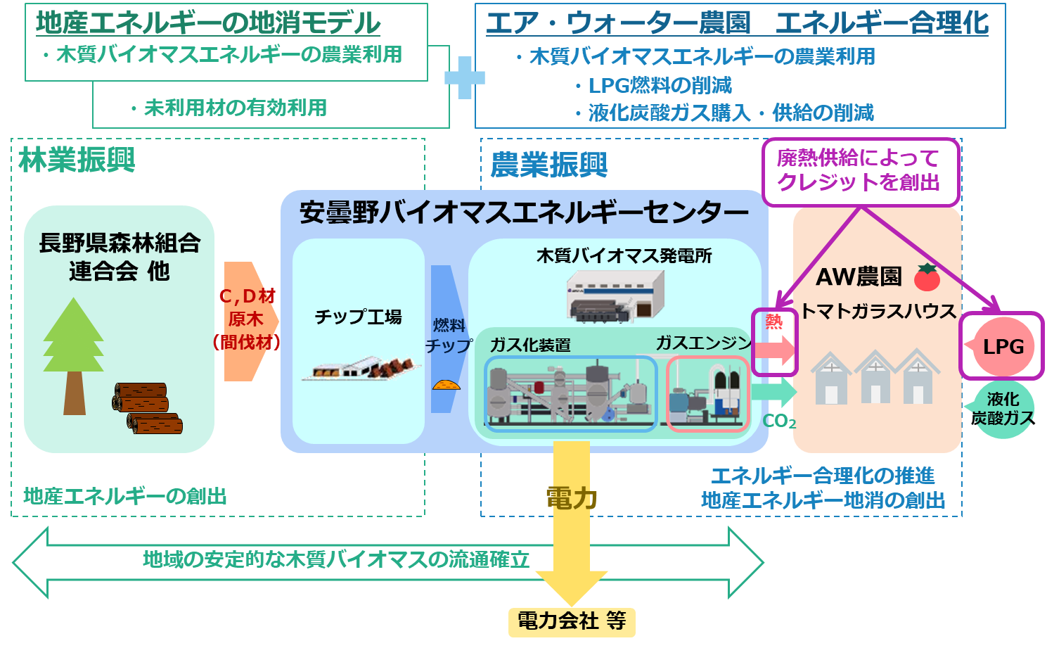 当社はエア・ウォーター農園の安曇野菜園(長野県安曇野市)敷地内に安曇野バイオマスエネルギーセンターを設け、木質バイオマスガス化発電設備を導入。2021年7月より、発電の過程で発生する廃熱およびCO\( \sf _2 \)を多く含む排ガスをトマト農園に供給する「トリジェネレーション事業」を開始しました。本プロジェクトは、この廃熱供給がそれまでトマト農園の保温に使用していたLPG燃料に代替することで削減できるCO\( \sf _2 \)排出量を対象にクレジットを創出します。